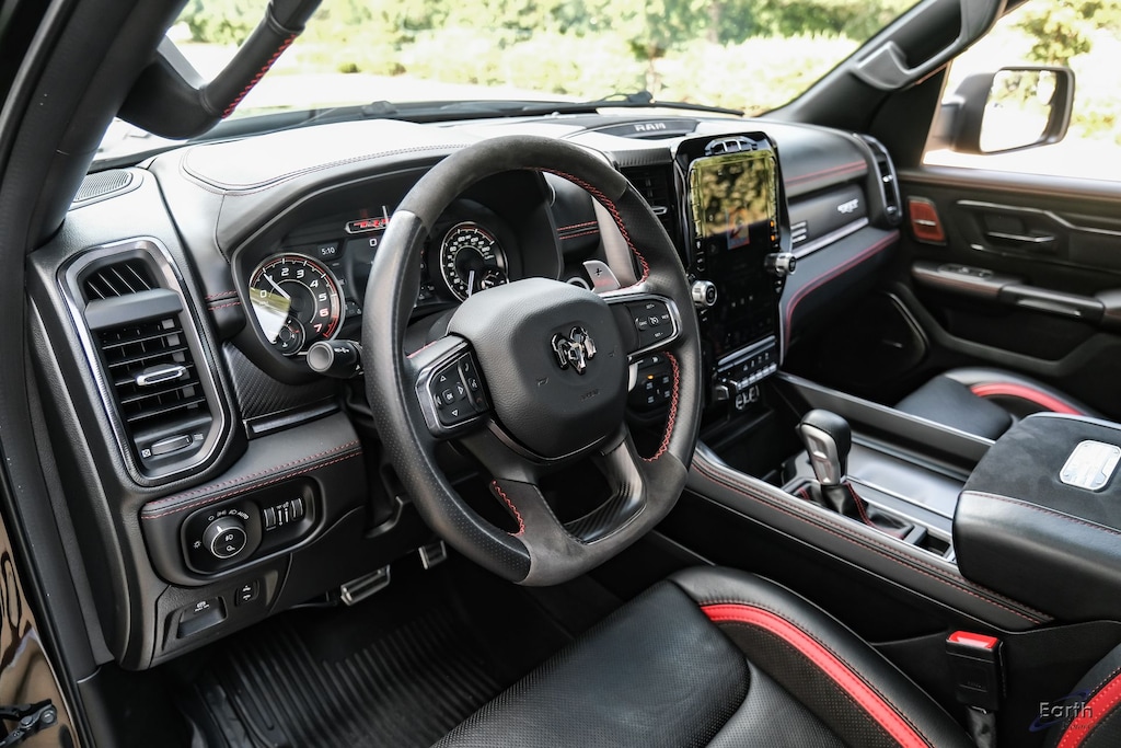 Earth MotorCars is Proud to offer this amazing: 2022 Ram 1500 TRX Level 2 Dual-Pane Pano Roof Carbon Fiber Package Clean CARFAX. CLEAN AUTOCHECK REPORT, Diamond Black Crystal PearlCoat Exterior Paint $100.00, #2 Seat Foam Cushion, 2-Door Passive Entry, Front Door Locks, 3.55 Rear Axle Ratio, 4 Way Front Headrests, 4-Wheel Disc Brakes, ABS brakes, Air Conditioning, Auto-dimming door mirrors, Automatic temperature control, Bed Utility Group, Blind Spot & Cross Path Detection, Body Color Door Handles, Bucket Seats, Center Console Parts Module, Digital Rearview Mirror, Dome Dual LED Reading Lamp, Driver Seat Memory, Driver/Passenger Wrapped Assist Handles, Dual front impact airbags, Dual front side impact airbags, Dual-Pane Panoramic Sunroof, Exterior Mirrors w/Memory, Front Bucket Seats, Front Door Accent Lighting, Front Seat Back Map Pockets, Front wheel independent suspension, Full Length Premium Upgraded Floor Console, Fully automatic headlights, harman/kardon 19 Speaker Premium Sound, Heads-Up Display, Heated Front Seats, Heated Second Row Seats, Heated Steering Wheel, Illuminated entry, IP LED Ambient Light Pipe, Leather Trimmed Bucket Seats, Leather/Carbon Flat-Bottom Steering Wheel, Leather/Suede Flat-Bottom Steering Wheel, LED CHMSL Lamp, Luxury Front Door Trim Panel, MOPAR 4 Adjustable Cargo Tie-Down Hooks, MOPAR Bright Pedal Kit, MOPAR Deployable Bed Step, MOPAR Spray In Bedliner, Navigation System, Panic alarm, ParkSense Front/Rear Park Assist w/Stop, Pick-Up Box Lighting, Power 4-Way Driver Lumbar Adjust, Power 4-Way Passenger Lumbar Adjust, Power 8-Way Driver & Passenger Seats, Power Adjustable Pedals w/Memory, Premium Wrapped IP Bezel, Quick Order Package 29Y, Radio: Uconnect 5 Nav w/12.0" Display, Radio/Driver Seat/Mirrors/Pedals Memory, Rain Sensitive Windshield Wipers, Real Carbon Fiber Interior Accents, Rear 60/40 Folding Seat, Rear 60/40 Folding Split Recline Seat, Rear Door Accent Lighting, Rear Underseat Compartment Storage, Rear Window Defroster, Remote Tailgate Release, Security system, Speed control, Sun Visors w/Illuminated Vanity Mirrors, Surround View Camera System, Tachometer, Telescoping steering wheel, Tilt steering wheel, Traction control, Trailer Brake Control, Trailer Light Check, Trailer Tire Pressure Monitoring System, Trailer Tow Group, Trip computer, TRX Carbon Fiber Package, TRX Level 2 Equipment Group, TRX Red Interior Accents, Universal Garage Door Opener, Ventilated Front Seats, Ventilated Rear Seats, Voltmeter, Wheels: 18" x 9" Black Paint/Polish Aluminum, Wireless Charging Pad.