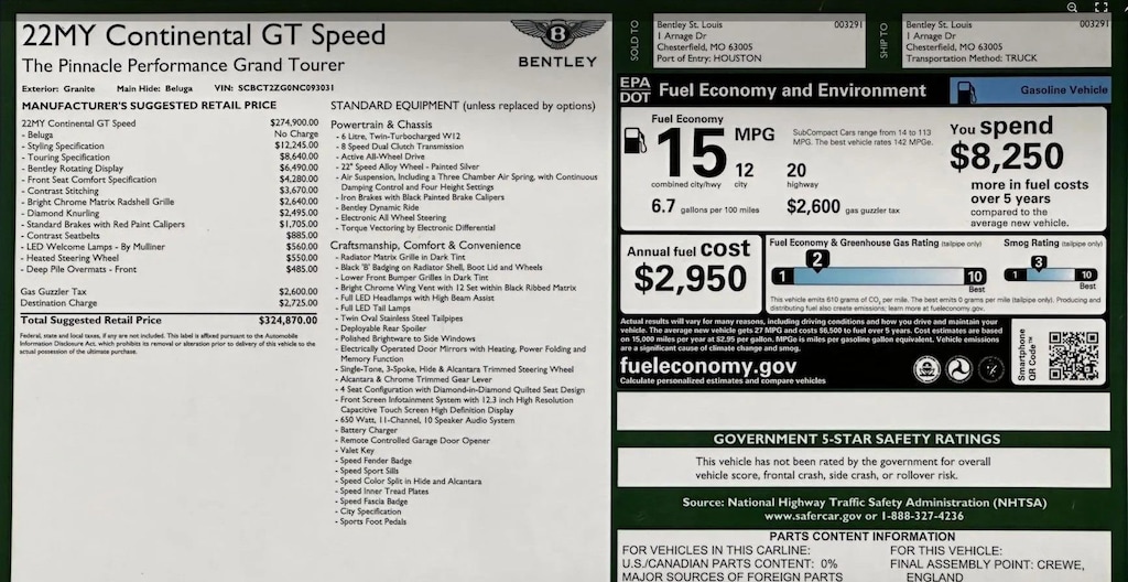 2022 BentleyContinental GT Speed TOURING $324,870 MSRP 2D Coupe