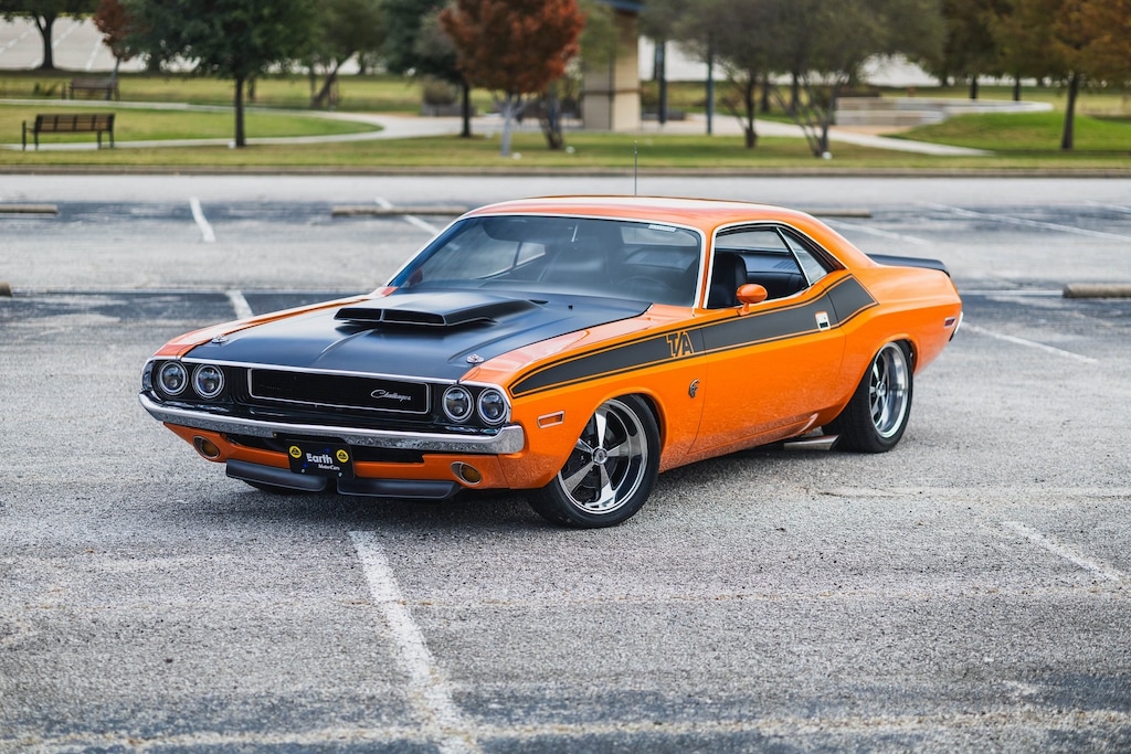 Earth Motorcars is excited to offer this amazing: 1970 Dodge Challenger Restomod in Go Mango over Black Bucket Seat Interior. Built by the famed GRAVEYARD CARS and featured in Season 17, Episode 7 of the TV show.