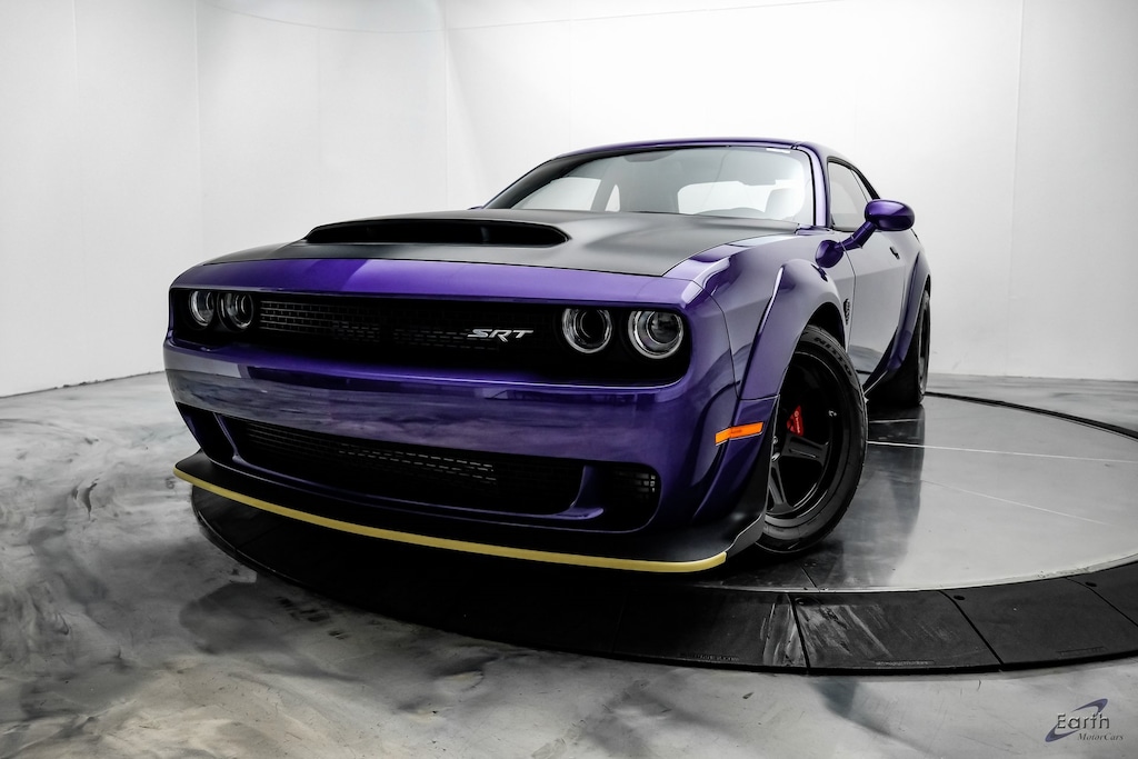 Earth MotorCars is Proud to offer this amazing: 2018 Dodge Challenger SRT Demon Rare Plum Crazy Like New 82-Miles with Crate! CARFAX One-Owner. Clean CARFAX. 18 Speakers Premium Audio System, 4-Wheel Disc Brakes, ABS brakes, Air Conditioning, Apple CarPlay/Android Auto, Auto High-beam Headlights, Auto-dimming Rear-View mirror, Automatic temperature control, Bright Pedals, Bumpers: body-color, Demon Car Cover, Demon Logo Laguna/Alcantara Seat, Demon Vehicle Storage Package, Dual front impact airbags, Dual front side impact airbags, Electronic Stability Control, Front Bucket Seats, Front Center Armrest, Front Floor Mats, Front Passenger Seat, Front Passenger Seat Belt Alert, harman/kardon GreenEdge Amp, Heated Front Seats, Heated Steering Wheel, Illuminated entry, Leather Seats Comfort Audio Group, Leather Trim Seats, MOPAR Battery Manager, Outside temperature display, Painted Black Satin Hood, ParkView Rear Back-Up Camera, Power 4-Way Driver Lumber Adjust, Power Tilt/Telescope Steering Column, Quick Order Package 26M, Rear window defroster, Security system, Speed control, Spoiler, Tachometer, Tilt steering wheel, Trunk Carpet Kit, Variably intermittent wipers, Ventilated Front Seats, Voltmeter, Wheels: 18" x 11.0" Aluminum.