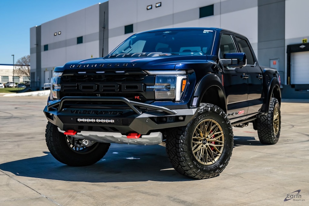 Earth MotorCars is Proud to offer this amazing: 2026 Ford F-150 Raptor R Hennessey Velociraptor 1000 in Antimatter Blue Metallic with Brembo Brakes and Hennessey Premium Leather-Alcantara Interior! Boasting 40+ percent more power at 1,043 HP the Hennessey VelociRaptoR 1000 has super truck capabilities with tire-shredding performance and a symphony of high-revving exhaust notes to match. Vehicle ETA is March-15-2026. Hennessey engineers improve the Raptor R's powertrain with performance enhancements including an upgraded 3.8-liter Whipple Supercharger System, High-flow air induction, Billet fuel rails, a Heavy-Duty Supercharger belt, upgraded fuel lines & fittings, an Air / Oil separator system, plus Hennessey's engine management calibration. It is outfitted with VelociraptoR Front and Rear Bumpers, Brembo Brakes, 20'' Hennessey Wheels, 37'' Off Road Tires, Front & Rear Suspension Leveling Kit, 3'' Overall Lift, Powered Electric Fold-Out Steps, Hennessey Exterior Badging, VelociraptoR 1000 Exterior Badges & Serial Number Plaques. All of this comes with Hennessey's 3 Year / 36,000 Mile Warranty. The VelociRaptoR 1000 delivers 1,043 BHP to achieve with supercar-like performance. Hennessey's super truck hits 60 mph from standing in just 3.1 seconds, and blasts a mile time of just 11.4 seconds @ 122 mph!, ANTIMATTER BLUE METALLIC 395.00, 4WD, 4-Wheel Disc Brakes, ABS brakes, Adjustable pedals, Air Conditioning, Auto High-beam Headlights, Automatic temperature control, Code Orange Front Tow Hooks, Code Orange Stitching Doors and Instrument Panel, Dual front impact airbags, Dual front side impact airbags, Dual Valve Shocks, Electronic Locking with 4.10 Axle Ratio, Equipment Group 803A Raptor R, Exposed Wheel Lock Kit, First Aid Kit with Ford Logo, Ford Connectivity Package (1-Year Included), Front Bucket Seats, Front Center Armrest, Interior Code Orange Raptor R Badging, Lane Departure Warning System, Modular Front Bumper, Navigation system: Connected Navigation, Radio: B&O Unleashed Sound System by Bang & Olufsen, Raptor R Badge Tailgate Applique, Raptor R Exterior Graphics, Raptor R Exterior Theme, Raptor R Interior Theme, Raptor R Unique Grille, Raptor R Unique Hood Vent with R Badge, Rear window defroster, RECARO with Code Orange Stitching Front Seats, Remote keyless entry, Removes 2KW Pro Power Onboard, Speed control, Steering wheel mounted audio controls, SYNC 4 with Enhanced Voice Recognition, Tachometer, Tough Bed Spray-in Bedliner, Twin Panel Moonroof, Unique Carbon Fiber Appliques, Upgraded Dual Exhaust, Wheels: Raptor R Unique 17" Forged Aluminum.