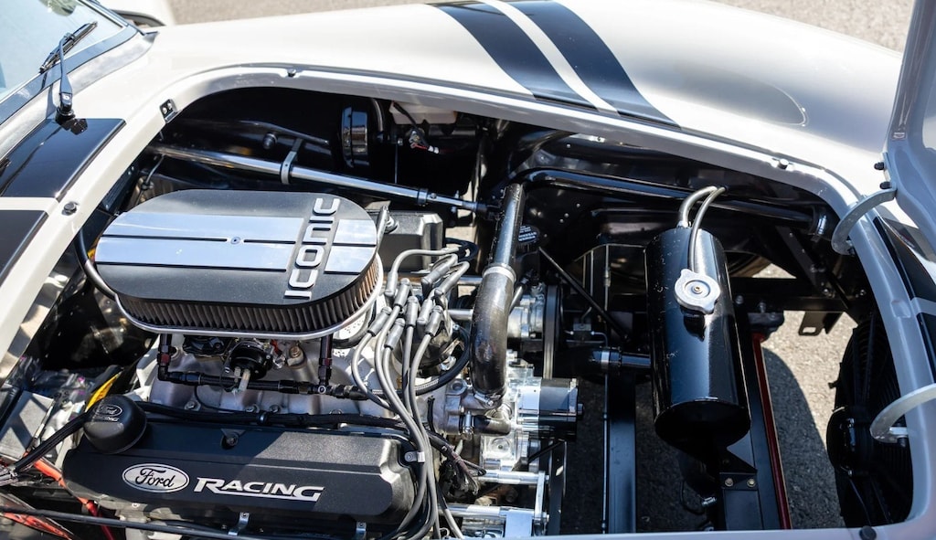 • & a hydraulic roller valvetrain. Power is sent to the rear wheels through a Tremec TKX 5-speed manual transmission and a Ford 8.8 IRS rear end with 3.55:1 gears. This Cobra sits on 18'' black knock-off wheels wrapped in Nitto NT555 G2 tires. This Cobra is also fitted with the blackout package deleting all the chrome. It has a Leather interior with diamond stitching. On the dash is a carbon fiber dashboard