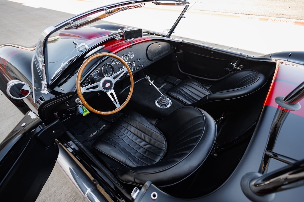This Superformance MKIII Roadster with 200 test miles, is a licensed Shelby product, with power upgraded by a new crate 435hp Ford Racing 5.0-liter DOHC 32-value Coyote V8 engine mated to a 5-speed TREMEC TKO 600 transmission. Features a stainless-steel surge tank, dual electric fans, Wilwood 4-wheel disc brakes, and custom ceramic-coated headers and side pipes. Inside there's a Cobra wooden steering wheel, Cobra-style gauges with reverse speedometer, and upgraded leather glove box, seats and dash. This roadster rides on 18-inch polished Satin Black pin-drive knock-off wheels. Finished in LumiLor electroluminescent paint applied by McLaren Classic Restorations. **TITLED AS 1965 SHLBY CBRA CV, ready for export as well.