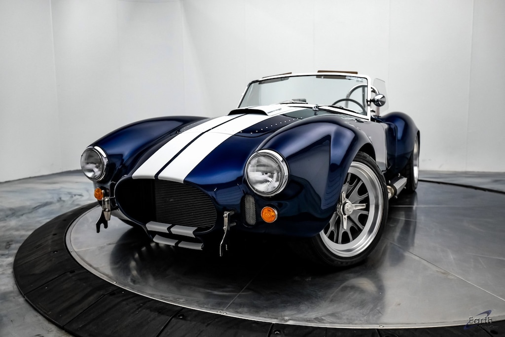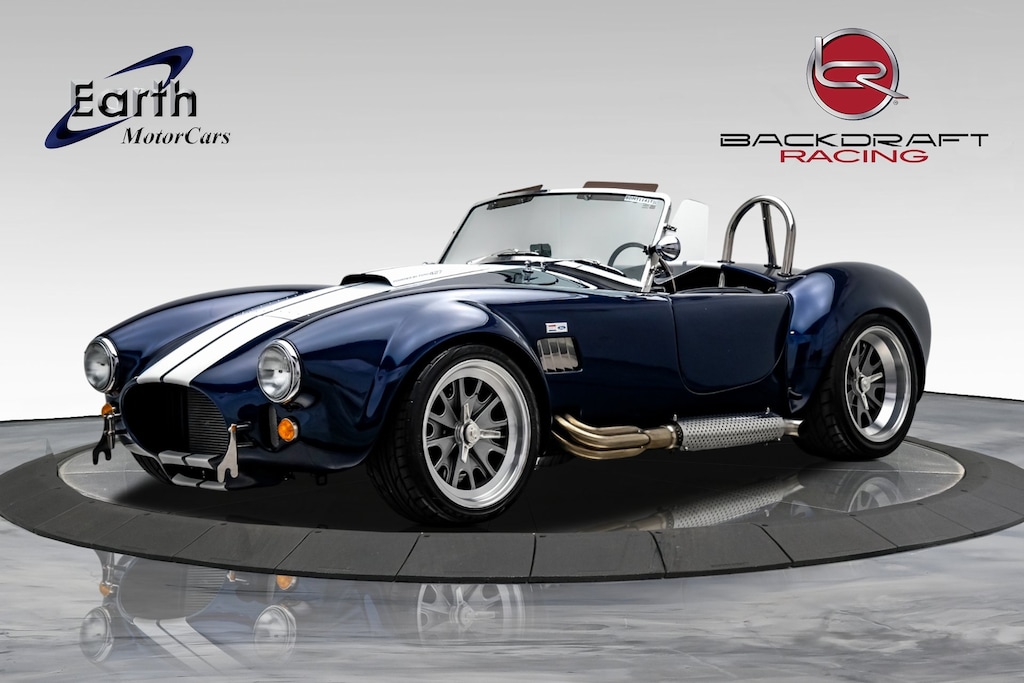 This stunning Shelby Backdraft Cobra presents in Indigo Blue Exterior with White stripes and classic Black leather interior. Classic Trim. Prestige 500hp 427 cu. in. V8, 5 speed manual transmission. Ceramic headers, Chrome engine accessories, 18 Wheels, Chrome side pipes, Cam style seat belts, Raydot Mirror, optional glove box, all new steering column mounted wiper and light controls as well as a traditional wooded steering wheel.